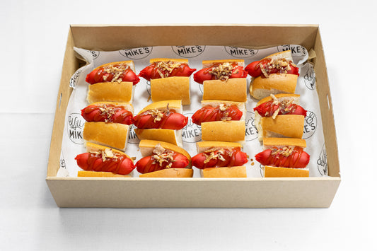 Mini Plain Hot Dogs with fried onions and tomato sauce (12 pieces)