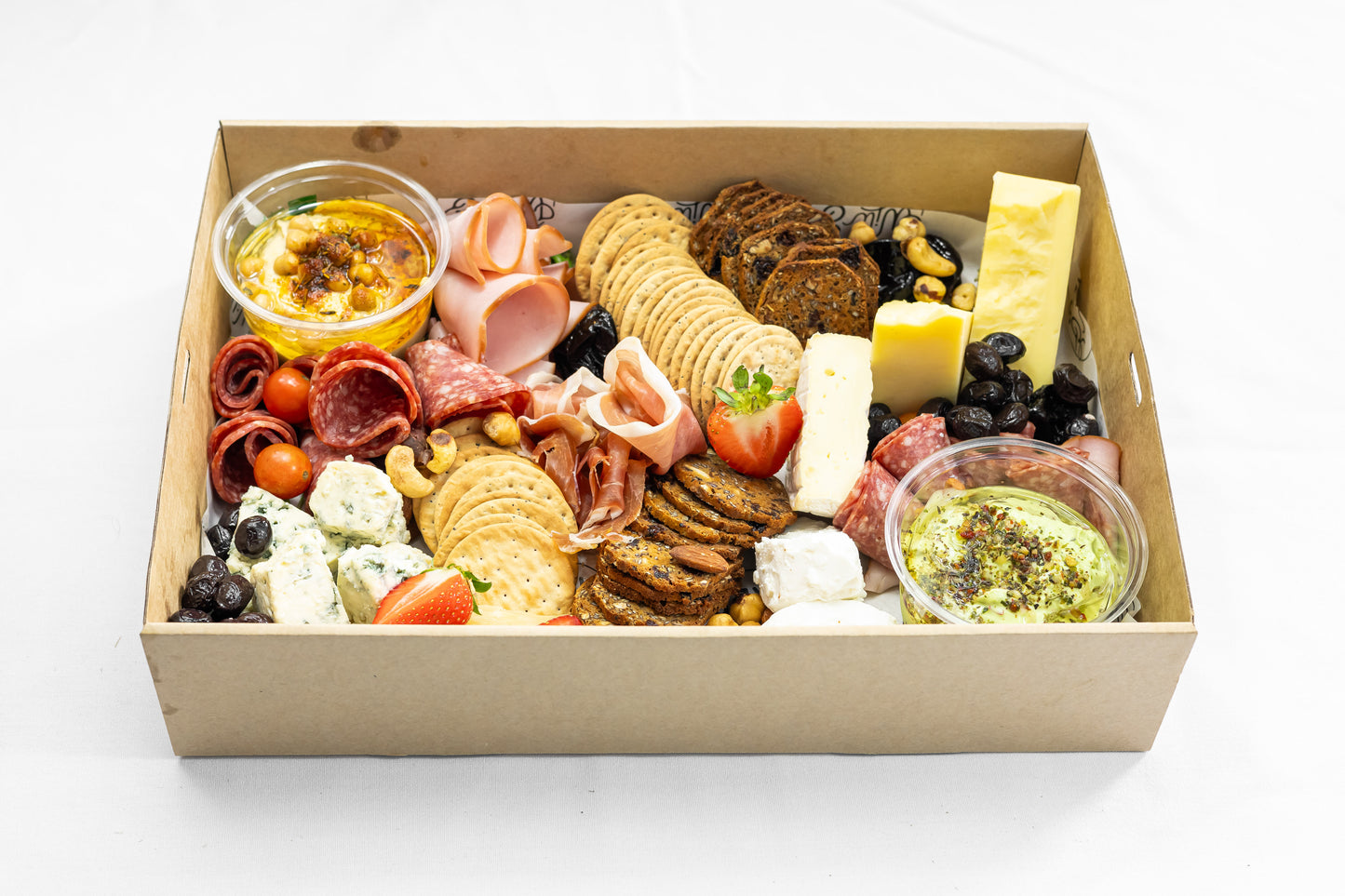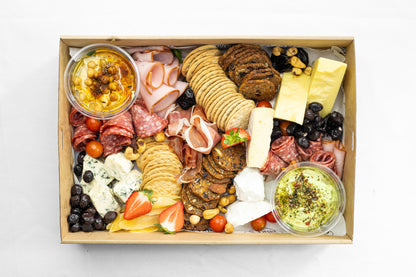 Embark on a Flavor Journey: Assorted Crackers, Strawberries, Brie, Cheddar, Blue Cheese, Salami, Prosciutto, and Smoked Ham, guacamole, hummus and olives.