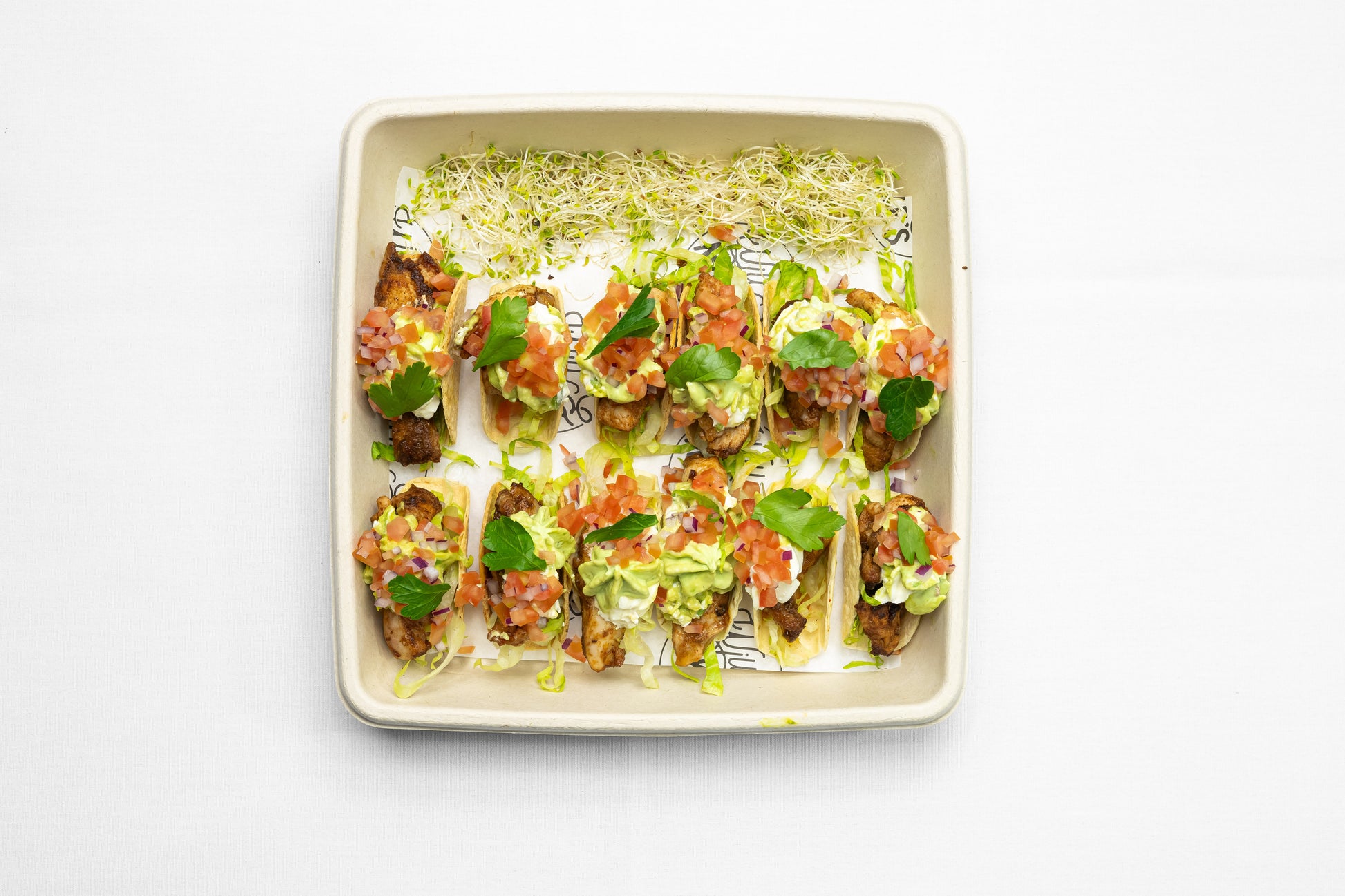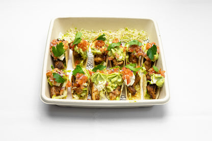 Mini Hard Shell Chicken Tacos with tomato salsa, sour cream, guacamole and marinated chicken