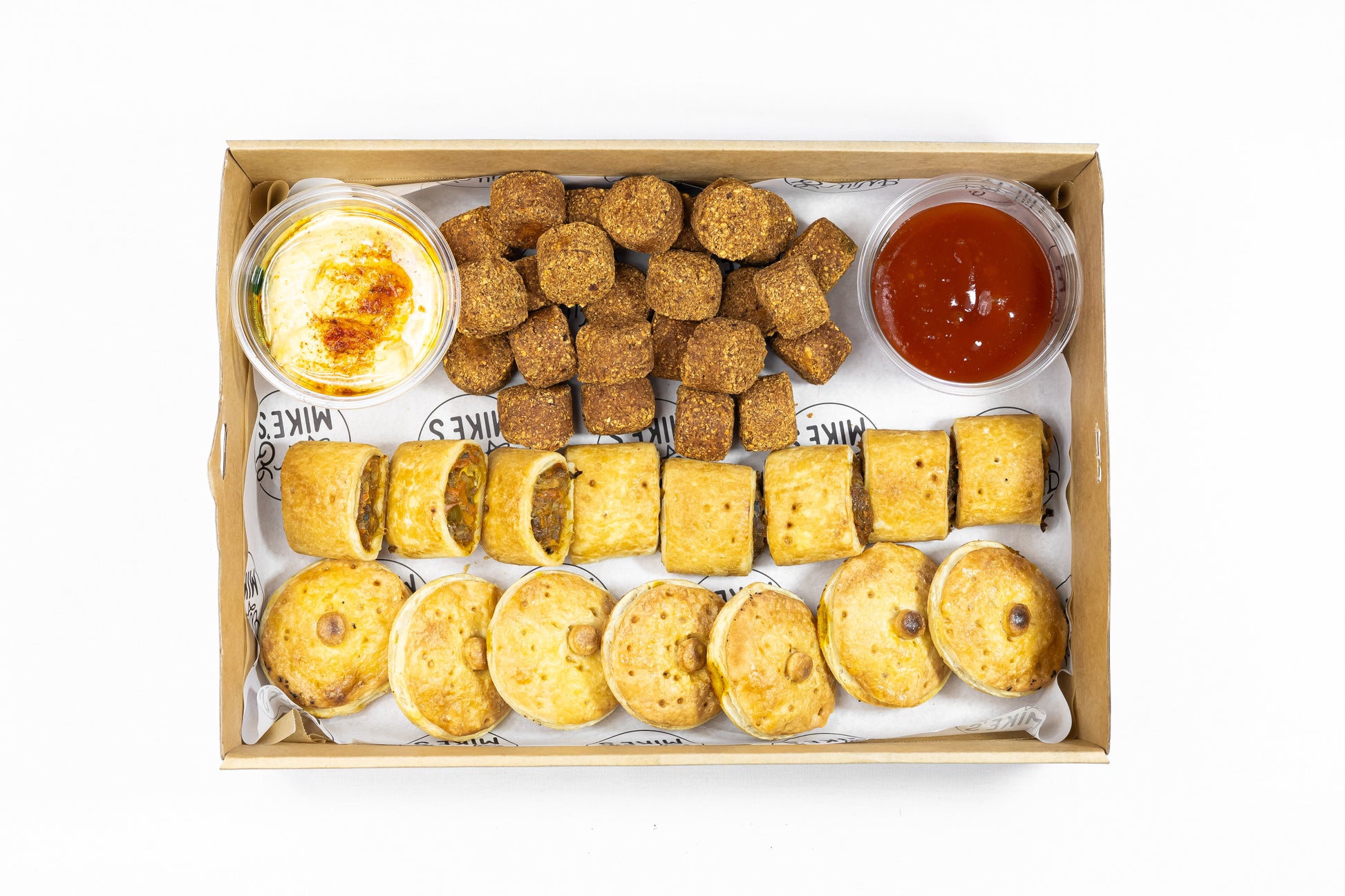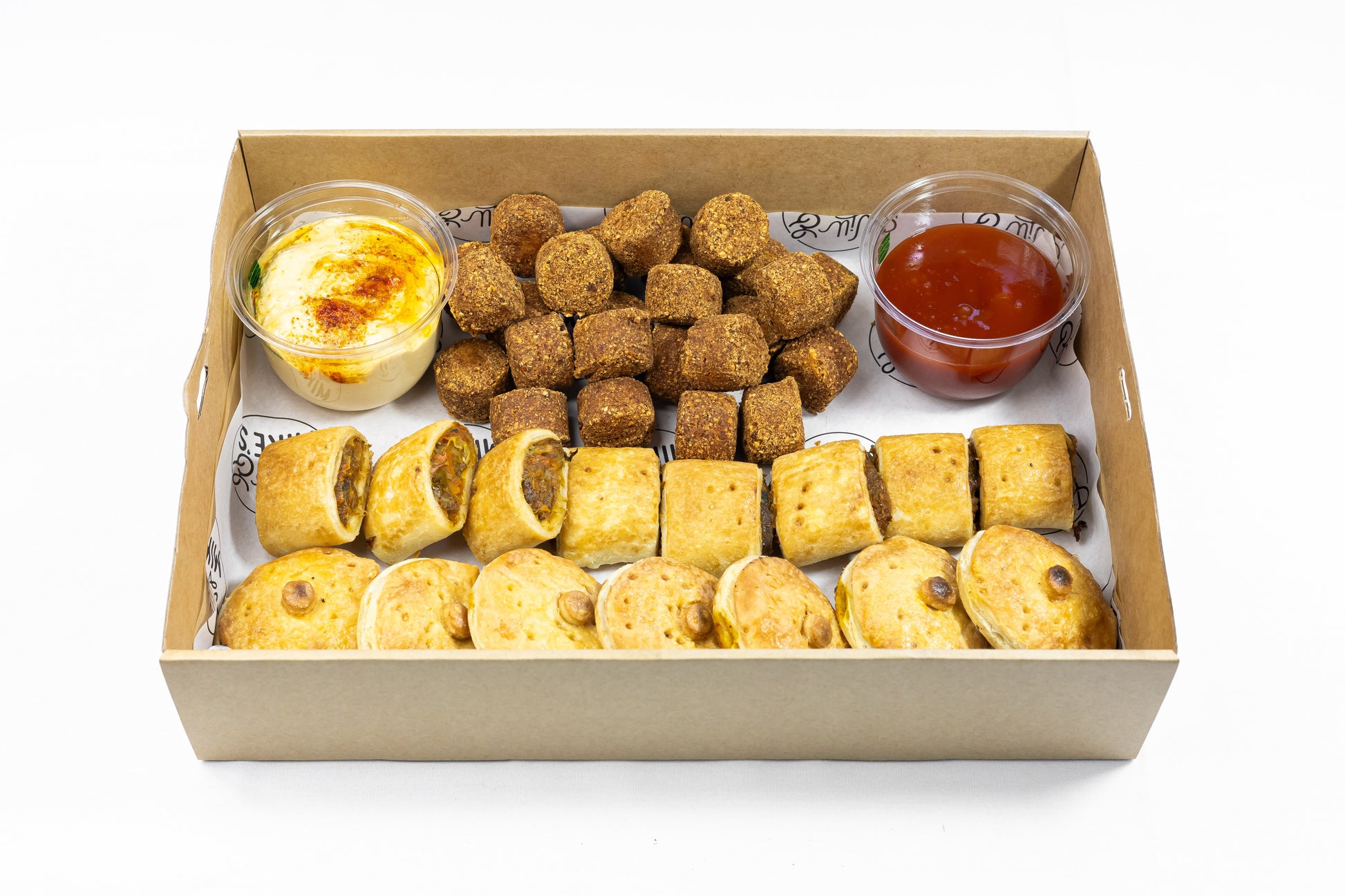 Vegan Sausage Rolls (8 pieces), Falafels (20 pieces) and Vegan Party Pies (7 pieces)