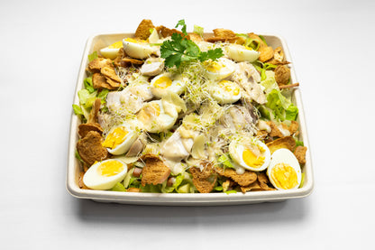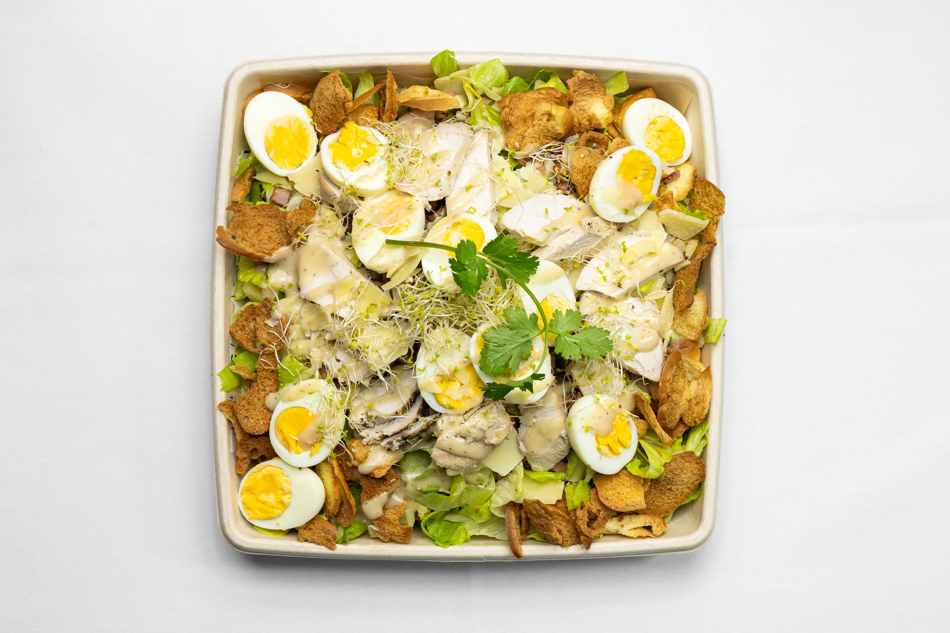 Indulge in W&M's Chicken Caesar, a classic favorite featuring tender grilled chicken breast atop crisp romaine lettuce, tossed with savory Caesar dressing, Parmesan cheese, and crunchy croutons for a satisfying and timeless salad experience.